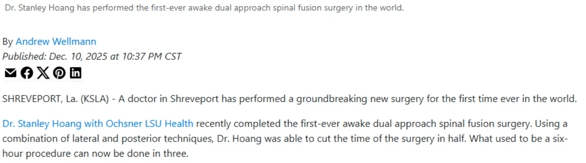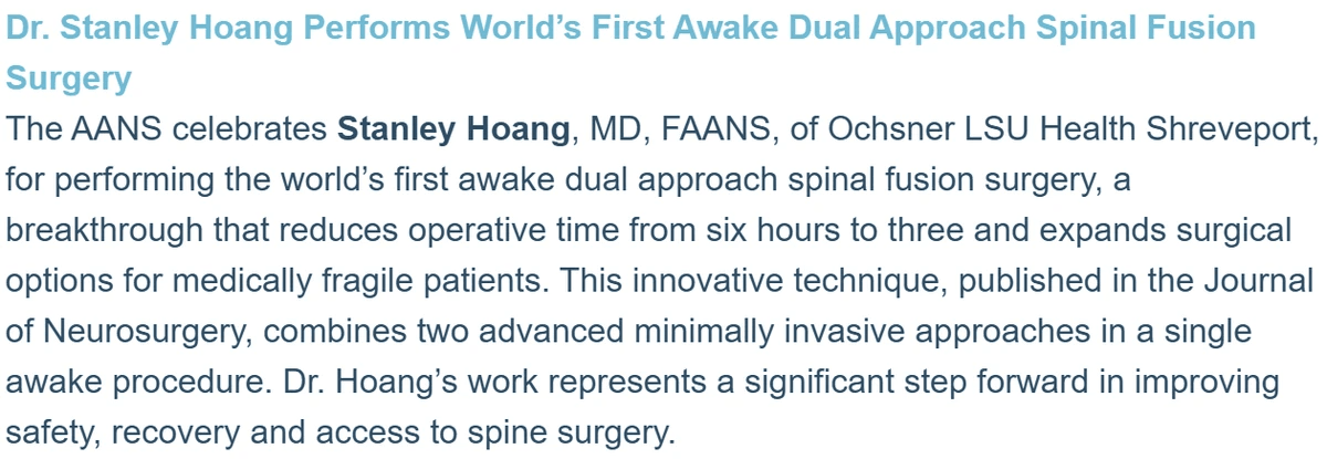Dr. Hoang performed the first robotic single position prone lateral lumbar fusion in the state of Louisiana in April 2023.